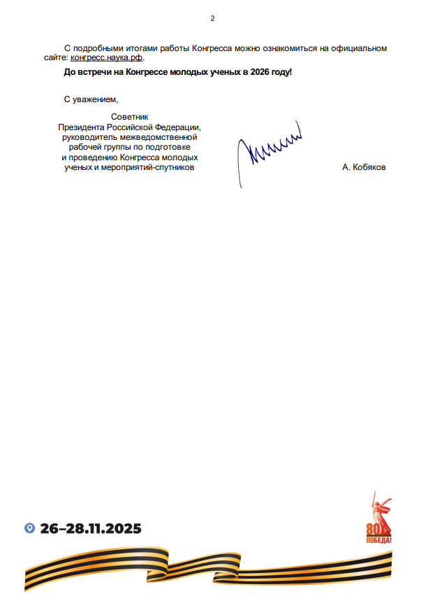 26-28 ноября 2025 состоялся юбилейный V Конгресс молодых ученых на площадке Сириус Сочи. Президент Российской Федерации подчеркнул, что Конгресс является одним из самых авторитетных и значимых событий в стране, которое способствует свободному общению, обмену мнениями и идеями, установлению новых контактов между научным сообществом, государством и бизнесом в целях научно-технологического развития страны.